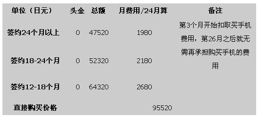 我們都知道日本的購買手機最主要是和運營商簽約購買,我們以夏普2009年夏季最新款手機Soft Bank 933SH為例,來說明一下在日本購買手機的成本。總的來說,就是簽約時間越長,購買手機價格越低,簽約時間越短,購買價格越高。