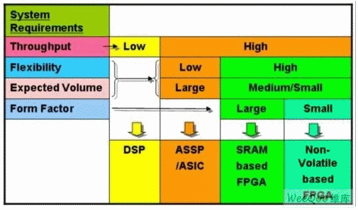 但是ASIC和ASSP帶來了高昂的非重復(fù)性工程費用成本,除非批量非常大。如果只有一小部分用戶使用特殊的功能模塊,那么FPGA解決方案可提供更好的回報。對于ASIC和ASSP,這些器件有限的功能和固有的不靈活性,不允許在設(shè)計完成后根據(jù)市場的要求改進或添加新的功能。FPGA卻能提供廣泛的功能和高度的靈活性。