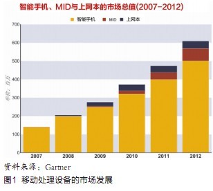 隨著3G對(duì)移動(dòng)信息處理的促進(jìn),未來幾年,MS市場(chǎng)尤其是智能化接入設(shè)備市場(chǎng)的增長(zhǎng)將非常迅速,根據(jù)有關(guān)機(jī)構(gòu)的分析,智能手機(jī)、MID、上網(wǎng)本等移動(dòng)上網(wǎng)裝置從2007年至2012年的年復(fù)合成長(zhǎng)率將達(dá)到36%,而到2012年為止,市場(chǎng)上將會(huì)有超過6億部的移動(dòng)終端,如圖1所示,藉由3G移動(dòng)通信和WLAN的帶動(dòng),移動(dòng)接入設(shè)備將實(shí)現(xiàn)從人手一部向人手兩部甚至多部的方向邁進(jìn)。
