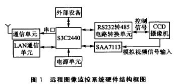 本系統(tǒng)采用三星公司的S3C2440嵌入式處理器和arm-linux2.4.26操作系統(tǒng);S3C2440使用ARM920T內(nèi)核,主頻是400MHz;除了集成通用的串口控制器、USB控制器、A/D轉(zhuǎn)換器和GPIO等功能之外,還集成了一個攝像頭接門(CAMIF)(這個接口是遠程圖像采集的核心部分)。系統(tǒng)在S3C2440處理器的控制下,從CCD攝像機采集模擬視頻信號,然后經(jīng)過編碼、DMA傳輸?shù)絻?nèi)存緩沖,接著由軟件對內(nèi)存中的數(shù)字視頻數(shù)據(jù)進行壓縮和打包.最后通過通信單元將圖像以IP包的方式發(fā)送到監(jiān)控中心的服務器。整個系統(tǒng)的硬件結構原理如圖1所示