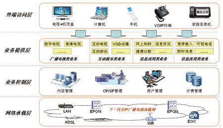 目前用戶是通過電視+機(jī)頂盒的方式享受廣電運(yùn)營(yíng)商提供的數(shù)字電視服務(wù),而未來用戶可通過計(jì)算機(jī)、手機(jī)、VOIP終端、家庭信息機(jī)等多樣化的終端訪問廣電運(yùn)營(yíng)商所提供的寬帶接入服務(wù)、VOIP的語音服務(wù)、各種信息化應(yīng)用服務(wù)。