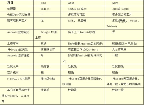 這三種處理器架構各有優(yōu)缺點,都希望成為未來Android互聯(lián)網電視(如果成功的話)的最主流平臺。那么哪一個處理器將最終勝出呢,答案只有留給時間來揭曉,我們不妨先來對這三個架構進行一番比較: