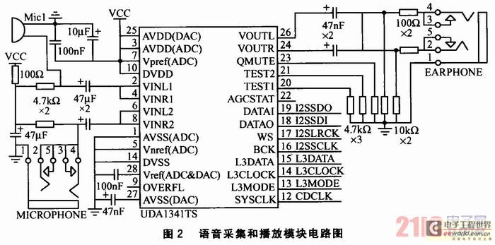 語音采集和播放模塊的作用是將音頻模擬信號轉(zhuǎn)換為數(shù)字信號,并對信號進行PCM編碼。其電路如圖2所示。采用Philips公司的UDA1341 TS型立體聲音頻CODEC進行音頻編解碼。該芯片提供2個麥克風(fēng)輸入,可實現(xiàn)單端輸入、差分輸入等靈活配置,并設(shè)置了可編程增益放大器和自動增益控制器,可保證高質(zhì)量的音頻獲。煌瑫r,還集成了聽筒和喇叭輸出的驅(qū)動器,喇叭音量可以通過編程調(diào)整。S3C2440A-40微處理器與UDA1341TS編解碼器通過I2S總線直接相連,并采用DMA發(fā)送/接收方式,完成系統(tǒng)的錄音和放音。