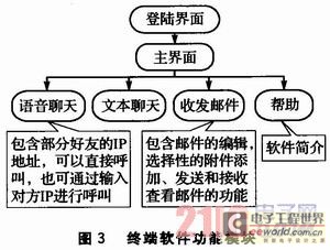 用戶打開終端軟件,可以根據(jù)自己的需要選擇語音聊天、文本聊天或者收發(fā)郵件。進行語音聊天前,用戶可以直接在好友欄中選擇聊天對象,也可直接輸入對方的IP進行連接。語音聊天的過程是:說話方,麥克風(fēng)采集模擬語音信號→語音芯片采集量化編碼→嵌入式系統(tǒng)對信號進行壓縮編碼→RTP格式打包→UDP格式打包→IP格式打包→Internet網(wǎng)絡(luò)傳輸;收聽方,接收語音數(shù)據(jù)→去IP/UDP/RTP包頭→嵌入式系統(tǒng)對信號解碼→語音芯片將數(shù)字語音信號轉(zhuǎn)為模擬信號→揚聲器播放。