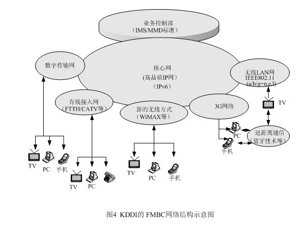圖中MMD是多媒體管理系統(tǒng),它是SIP技術(shù)中的一個核心技術(shù),使用MMD可對固定電話與移動電話進行統(tǒng)一控制,在MMD平臺上,電話、可視電話和圖像等業(yè)務(wù)能以模塊方式追加,在統(tǒng)一的IP網(wǎng)上,可對固定電話與移動電話兩種用戶,去提供聲音、動畫等各種各樣的業(yè)務(wù)。MMD的核心是在用戶開始通信時的呼叫控制,和依據(jù)用戶終端狀態(tài)對用戶在線進行管理,當用戶在通話時由外邊返回家后,MMD平臺即對用戶信息進行更新,同時又把與外邊通話的用戶切換到家中的固定電話機上,連接成新的通話回路,實現(xiàn)對移動電話與固定電話的統(tǒng)一控制,利用這些機能,可實現(xiàn)FMC。KDDI使用MMD的業(yè)務(wù)試驗在2006年2月的超3G實驗計劃中,得到了驗證。如當你拿著手機一邊通話,一邊回到自己家中時,就會將通話轉(zhuǎn)到電視上,在大畫面上繼續(xù)通話,這就是未來FMBC的一種業(yè)務(wù)模式。