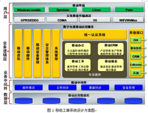 移動(dòng)工單系統(tǒng)是在Windows Mobile智能手機(jī)操作系統(tǒng)上自主研發(fā),采用B/S和C/S混合架構(gòu),以TCP/IP作為基礎(chǔ)數(shù)據(jù)傳輸協(xié)議,通過移動(dòng)通信網(wǎng)絡(luò)無線數(shù)據(jù)通道GPRS/EDGE/CDMA1x等,將呼叫中心的工單數(shù)據(jù)推送到智能手機(jī)上,由外勤服務(wù)人員將服務(wù)情況進(jìn)行實(shí)時(shí)的反饋。利用的同步中間件可將最新的資訊文件推送到手機(jī)終端上,服務(wù)人員無需登錄即可在終端可以查看最新的廣電資訊,可支持doc、xls、ppt等 Office文檔格式的瀏覽,支持WMV、WAV、3GP多種音視頻文件播放。服務(wù)人員可以不受地點(diǎn)和時(shí)間的限制通過終端實(shí)時(shí)獲取最新的多媒體客戶交互中心運(yùn)營(yíng)數(shù)據(jù)報(bào)表,圖2為系統(tǒng)設(shè)計(jì)方案圖。