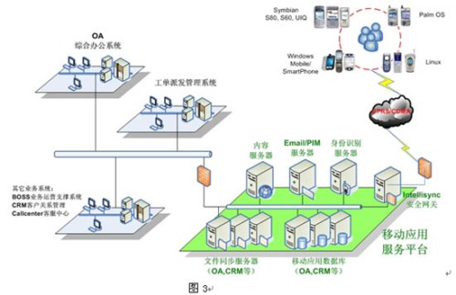 用戶通過智能手持終端訪問應(yīng)用,平臺(tái)支持采用Symbian、SmartPhone、PocketPC和Palm操作系統(tǒng)的終端,還支持SyncML、brew、java、Windows PC的應(yīng)用。