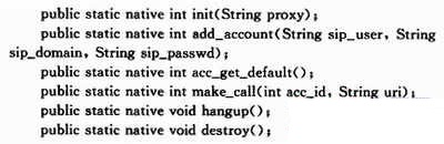 系統(tǒng)的主程序是一個(gè)標(biāo)準(zhǔn)的Android應(yīng)用程序,它使用Java語言開發(fā),符合SDK規(guī)范。與一般的SDK程序不同的是,該類中必須使用Syst-em.loadLibrary加載PJSIP庫(kù)文件。形式如下: