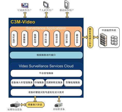 高新興通信最新推出基于云計算的C3M-Video視頻監(jiān)控管理平臺,具有視頻監(jiān)控管理平臺的通用功能和業(yè)務(wù)流程,能支持國內(nèi)外主流的視頻設(shè)備。此外,能與高新興現(xiàn)有的動力環(huán)境監(jiān)控系統(tǒng)進(jìn)行深度的融合,并以此為基礎(chǔ)逐步演繹成一個支撐物聯(lián)網(wǎng)應(yīng)用的融合監(jiān)控平臺。