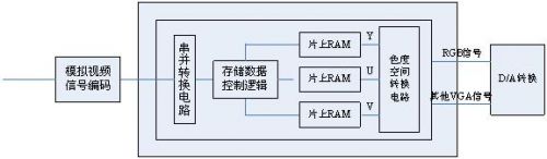 由于YUV信號在模擬信號中是交織著的,所以需要一個信號選擇電路。YUV一共是三路信號,設(shè)計一個計數(shù)器進行選擇,計數(shù)是O和2時,是UV信號,計數(shù)是1和3時是Y信號,完成的實際上是串行信號轉(zhuǎn)并行信號的過程。以上過程可以用圖3的原理框圖來表示。