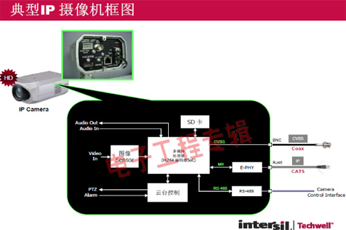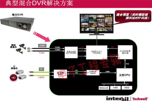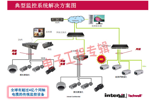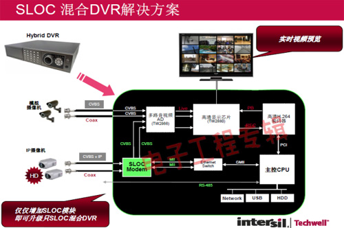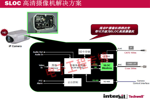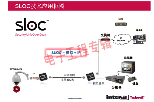 革命性的Intersil Techwell SLOCTM(Security Link over Coax)同軸電纜復(fù)合視頻傳輸解決方案是可通過一條同軸電纜同時傳輸模擬 CVBS 視頻和高清數(shù)字 IP 視頻信號的先進(jìn)調(diào)制解調(diào)器解決方案,其采用最新MODEM PHY技術(shù)的傳輸解決方案,可以基于同軸電纜同時傳輸高清IP碼流和標(biāo)清模擬實時視頻。