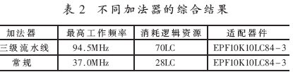 (2)針對(duì)不同運(yùn)算的位寬需要,設(shè)計(jì)專用的加法器和乘法器。本文對(duì)整數(shù)變換中的加法器采用三級(jí)流水線加法器,實(shí)現(xiàn)9位加法,每級(jí)流水線完成三位超前進(jìn)位加法,將邏輯延遲限制在三位加法器之內(nèi)。圖2給出了9位加法器的流水線實(shí)現(xiàn)框圖。選用EPF10K10LC84-3作為適配器件,經(jīng)過Synplify Pro 7.3綜合,結(jié)果表明這種加法器具有較優(yōu)的最高工作頻率和硬件開銷。如表2所示, 常規(guī)加法器的最高工作頻率為37.0MHz,消耗資源卻為28LC,而經(jīng)過優(yōu)化的三級(jí)流水線加法器在消耗資源增加不多的情況下,其最高工作頻率相比常規(guī)加法器提高了257%,達(dá)到94.5MHz。