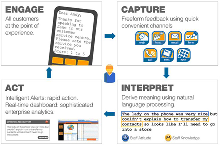 該應用軟件能夠捕捉所有聯(lián)絡渠道上任何形式的客戶反饋;包括文本,郵件,電話,網絡或者手寫的。然后系統(tǒng)利用先進的模式識別規(guī)則對客戶反饋進行破譯并采取適當的行動;直接響應客戶,將信息轉發(fā)給其他更適合響應的人并創(chuàng)建實時管理信息。