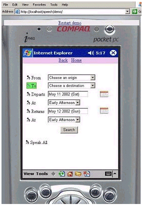 .NET Speech SDK目前為免費(fèi)提供。其中包括設(shè)置Web應(yīng)用的語音輸入/輸出動(dòng)作的工具、用于根據(jù)不同的應(yīng)用來限制終端用戶語言的語音語法編輯器、語音即時(shí)編輯器、語音調(diào)試工具以及嵌入到WWW瀏覽器(面向個(gè)人電腦的IE)中的試驗(yàn)用插件等。微軟今后還將繼續(xù)強(qiáng)化其功能,在2003年公布正式版以前,準(zhǔn)備追加使用電話的語音識(shí)別功能、支持用于PDA的“Pocket Internet Explorer”的語音識(shí)別插件,以及在終端和服務(wù)器上負(fù)責(zé)語音處理的分散型語音識(shí)別功能等。上圖顯示了具有語音識(shí)別功能的面向Pocket PC的應(yīng)用的演示畫面。單擊左測的麥克風(fēng)形狀的圖標(biāo)后,就可以利用語音操作菜單。另外,.NET Speech SDK 1.0版只有英文版,供貨時(shí)間尚未確定的2.0版據(jù)稱將支持日語和其他語言。
