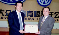 向一汽-大眾客服中心部長(zhǎng)石濤(右)頒發(fā)“副主任委員”聘書