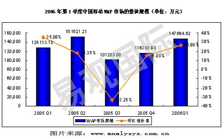 新華美通消息:易觀國際研究表明,2006年第一季度,WAP 業(yè)務(wù)整體上繼續(xù)呈現(xiàn)增長態(tài)勢。但是兩大運(yùn)營商的 WAP 業(yè)務(wù)卻呈現(xiàn)出不同的發(fā)展態(tài)勢。