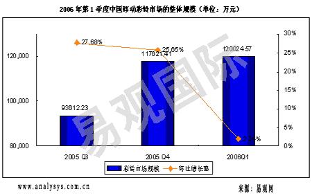 新華美通消息:易觀國(guó)際研究表明,2006年第一季度,CRBT 業(yè)務(wù)整體市場(chǎng)規(guī)模達(dá)到16億元,環(huán)比增長(zhǎng)率為5%,增長(zhǎng)速度較上個(gè)季度大幅度下降,業(yè)務(wù)已經(jīng)進(jìn)入低級(jí)飽和期。其中中國(guó)移動(dòng)的彩鈴業(yè)務(wù)的市場(chǎng)規(guī)模環(huán)比增長(zhǎng)率僅僅為2%,如果扣除中國(guó)移動(dòng)和中央電視臺(tái)合作進(jìn)行的春晚彩鈴業(yè)務(wù)收入,中國(guó)移動(dòng)彩鈴業(yè)務(wù)市場(chǎng)規(guī)模實(shí)際略有下降。