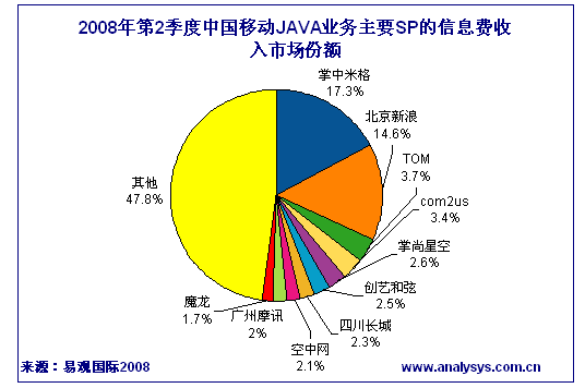 易觀國(guó)際近期發(fā)布《2008年第2季度中國(guó)手機(jī)游戲市場(chǎng)季度監(jiān)測(cè)》顯示:中國(guó)移動(dòng)JAVA業(yè)務(wù)SP信息費(fèi)方面,掌中米格、北京新浪分居前兩名,兩者市場(chǎng)占有率已提高至31.9%。其中掌中米格信息費(fèi)季度收入達(dá)到2505.86萬(wàn)元,市場(chǎng)占比為17.3%,而新浪信息費(fèi)收入市場(chǎng)占比為14.6%。信息費(fèi)收入的第3至第5名依次為T(mén)OM、com2us、掌尚星空,三者總市場(chǎng)占比為9.7%。