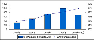 中國移動通信增值業(yè)務市場經(jīng)歷了一個曲折的發(fā)展歷程后開始日趨理性,2007年以來,移動通信增值業(yè)務的發(fā)展由爆發(fā)式增長進入平穩(wěn)快速發(fā)展階段。據(jù)統(tǒng)計,2008年上半年,中國移動增值服務市場規(guī)模達672.76億元,同比增長30%。其中短信市場規(guī)模以65.34%的比例位居第一,彩鈴和WAP分別以18.07%和8.61%的份額居其次。