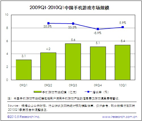 2010Q1中國手機(jī)游戲市場規(guī)模為5.4億,環(huán)比增長5.9%.2009年底電信運(yùn)營商調(diào)整業(yè)務(wù)合作伙伴計費(fèi)政策,導(dǎo)致WAP和G+手機(jī)游戲平臺等特定計費(fèi)平臺暫時停止計費(fèi),對手機(jī)游戲市場營收增長產(chǎn)生不利影響。除了季節(jié)因素以外,手機(jī)單機(jī)游戲受電信運(yùn)營商暫停WAP計費(fèi)影響較大,手機(jī)網(wǎng)游受政策影響有限。盡管本季度手機(jī)游戲市場扭轉(zhuǎn)營收規(guī)模下滑的不利局面,重新恢復(fù)增長態(tài)勢,但是手機(jī)游戲?qū)﹄娦胚\(yùn)營商計費(fèi)通道的高依存度,決定行業(yè)受政策風(fēng)險的影響較大。實(shí)現(xiàn)營收多元化是手機(jī)游戲業(yè)界思考和關(guān)注的問題。