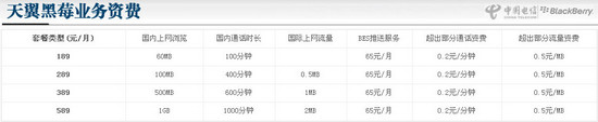 目前電信推出的黑莓手機(jī)套餐分為四類,一類為天翼黑莓簡(jiǎn)裝版,價(jià)格為每月189元,包括60MB國(guó)內(nèi)上網(wǎng)流量,100分鐘國(guó)內(nèi)語(yǔ)音通話時(shí)長(zhǎng);第二類是天翼黑莓標(biāo)準(zhǔn)版套餐,價(jià)格為289元,包括100MB國(guó)內(nèi)上網(wǎng)流量,0.5MB國(guó)際上網(wǎng)流量,400分鐘國(guó)內(nèi)語(yǔ)音通話時(shí)長(zhǎng);第三類和第四類為天翼尊享版套餐包括389元和589元兩種資費(fèi),前者包括500MB國(guó)內(nèi)上網(wǎng)流量,1MB國(guó)際上網(wǎng)流量,600分鐘國(guó)內(nèi)語(yǔ)音通話時(shí)長(zhǎng);后者包括1GB國(guó)內(nèi)上網(wǎng)流量,2MB國(guó)際上網(wǎng)流量,1000分鐘國(guó)內(nèi)語(yǔ)音通話時(shí)長(zhǎng)。