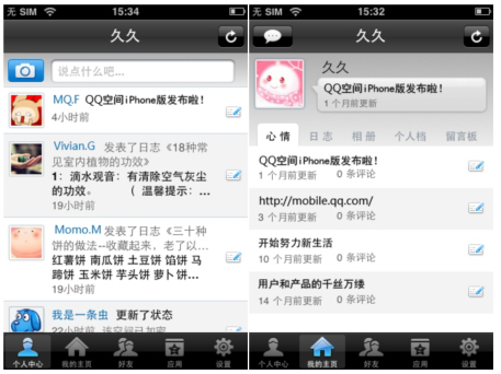 點(diǎn)擊我的主頁,可以瀏覽和撰寫自己的心情、查看日志,瀏覽和上傳照片,并且還可以查看好友留言。與其他手機(jī)平臺的QQ空間不同的是,QQ空間foriPhone將空間好友單獨(dú)列出來,更人性化的加入了“誰看過我”和“我看過誰”功能,方便用戶查找。