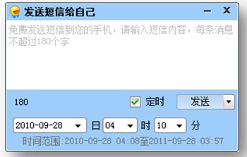 迷你飛信1.0 beta版另一大亮點就是類似于“移動小秘書”的自我短信定時發(fā)送功能。用戶只需直接在好友列表或使用快捷鍵“Ctrl+Alt+W”,就打開了給自己發(fā)送定時短信的窗口。這一功能將滿足用戶通過飛信進行“短信提醒”的使用需求。