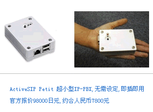 日本C-Borne公司發(fā)布了世界上最小的IP-PBX產(chǎn)品ActiveSIP Petit,采用Asterisk(米國Digium,Inc.開発),具備昂貴的專有PBX所有功能。這款比手掌還要小的IP-PBX設備適合小型辦公室和商店使用,可以通過網(wǎng)絡更新配置和設置,無需專業(yè)IP人士也可以搭建IP-PBX環(huán)境。利用楽天株式會社的Fusion通訊服務,將大大降低成本電話費和電信設備投資。