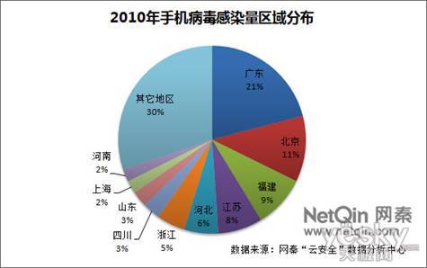 北京時間12月14日消息 近日,北京網(wǎng)秦天下科技有限公司(以下簡稱網(wǎng)秦)發(fā)布了《2010年中國大陸地區(qū)手機安全報告》[下載]。報告指出,據(jù)網(wǎng)秦“云安全”數(shù)據(jù)分析中心統(tǒng)計:截至2010年11月,新增手機病毒1513個,累積病毒數(shù)量達(dá)2357個。預(yù)計2010年手機病毒總數(shù)將超過2500種以上,同比增長193%,累計感染手機800萬部以上。其中,我國廣東地區(qū),以21%的感染比例位居首位,北京,上海,福建、江蘇等地位居其后。