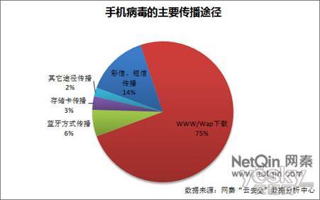 感染途徑方面,《2010年中國大陸地區(qū)手機安全報告》指出,據(jù)網(wǎng)秦“云安全”數(shù)據(jù)分析中心統(tǒng)計,當(dāng)前通過手機訪問wap和www網(wǎng)站感染病毒的比率達(dá)75%;通過短信、彩信感染病毒的比率占14%;通過藍(lán)牙傳輸方式感染病毒的比率占6%;通過存儲卡等途徑感染病毒的比率占3%;另外2%的用戶則是被其它傳播途徑的病毒感染。其中聯(lián)網(wǎng)感染病毒的機率最大,成為用戶面臨的最主要威脅。