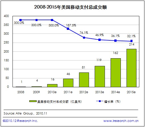 艾瑞咨詢根據(jù)Aite Group發(fā)布的數(shù)據(jù)發(fā)現(xiàn),2010年美國移動支付總成交金額預(yù)估值為16億美元,預(yù)計2015年這一數(shù)字將攀升至214億美元,將是2010年的13.4倍,復(fù)合年增長率為68%。長期以來,美國移動支付總成交額一直處于被低估的狀態(tài),但它的實際表現(xiàn)遠(yuǎn)比預(yù)想要好很多。其中,2010年到2011年增長率將高達187%。