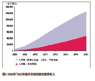另外一個預測也可說明這一趨勢:2010年到2015年小屏幕移動寬帶連接的復合年均增長率為45%,而大屏幕的復合年均增長率為36%,到2015年新興市場上將有16億的小屏幕連接和近4.59億的大屏幕連接。