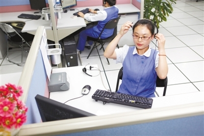 昨日,中國聯(lián)通二區(qū)分公司內(nèi),接線員郭婷玉在為打進(jìn)電話的市民處理完預(yù)約掛號服務(wù)后摘下耳機(jī)。