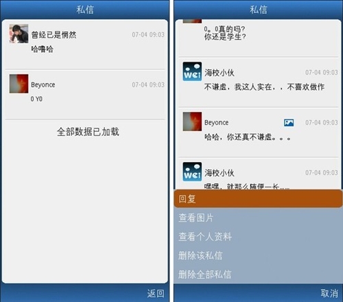 武俠小說中每每寫到傳音時(shí),都愛這樣寫“不世高人傳音入密……”。這不世高人的稱號(hào)可是讓人夢寐以求啊。語音微博1.6 for Symbian最新加入的私信功能助你一償夙愿。每每查看其他用戶以及他的語音微博時(shí),你都可以看到私信按鈕,點(diǎn)擊即可發(fā)送私信。傳音入密就是這樣簡單。當(dāng)然,除了語音,你也可以傳送文字,很貼心有木有。