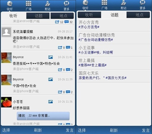 語音微博是由夢想兄弟專為喜歡娛樂八卦、搞笑趣聞的各路青年打造的跨平臺(tái)語音社交軟件。用戶可以免費(fèi)發(fā)布、收聽語音、文字、圖片形式的微博分享信息,還可以用語音進(jìn)行回復(fù)、評論,同時(shí)更有LBS地理定位功能幫助用戶交友、定點(diǎn)發(fā)布和收聽某一地區(qū)的語音微博。