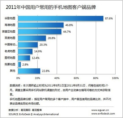 EnfoDesk易觀智庫研究發(fā)現(xiàn):進(jìn)入2011年下半年以來,手機(jī)地圖市場發(fā)展有以下幾方面趨勢:
