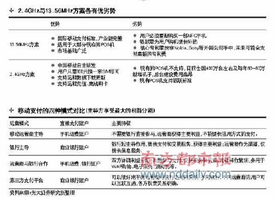 對此,國金證券發(fā)布了一份研究報告稱,相對于13 .56MHz方案而言,2.4GHz方案在推廣上有先天的優(yōu)勢。畢竟13.56M H z方案必須對手機重新設計,需要等待手機產業(yè)鏈對13.56M H z的逐步支持,時間周期較長;同時,更換13.56M H z手機帶來的重置成本無論是由用戶承擔還是由運營商承擔都是一筆高額的費用,推廣難度較高。而2.4G H z方案僅需更換SIM卡便可完成對手機的改造,不用等待終端產業(yè)鏈的成熟;同時改造成本低,便于運營商進行促銷推廣。