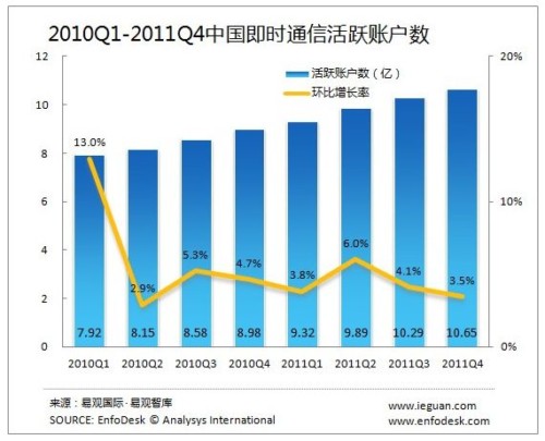 CTI論壇(ctiforum)3月23日消息(記者 潘婷婷): 根據EnfoDesk易觀智庫發(fā)布的《2011年第4季度中國即時通信市場季度監(jiān)測》數據顯示,截止到2011年底,中國即時通信活躍賬戶數達到10.65億,環(huán)比增長3.5%,同比增長18.62%。
