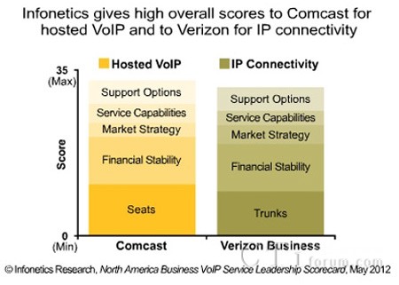 Infonetics Research公司VoIP 和IMS主要分析師Diane Myers 表示:“Comcast公司收購了New Global Telecom,前者在我們企業(yè)VoIP平衡記分卡中常年領(lǐng)先,今年這個收購?fù)苿覥omcast公司在Infonetics的托管業(yè)務(wù)VoIP領(lǐng)導(dǎo)力計(jì)分卡中位于第一的位置,連續(xù)四年的排名中,Verizon Business公司在IP 互聯(lián)領(lǐng)導(dǎo)力平衡計(jì)分卡中處于第一的位置,其次是AT&T公司”