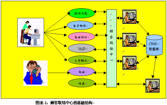 。。呼叫中心通過多年以來的發(fā)展,其傳統(tǒng)型的呼叫中心還是主要在以電話為媒介服務(wù)于顧客。這類呼叫中心的基礎(chǔ)結(jié)構(gòu)包括ACD、IVR、CTI等技術(shù)應(yīng)用平臺和界面,同時與企業(yè)的后臺資源相連接,例如大型或相關(guān)數(shù)據(jù)庫。但是,當(dāng)今的呼叫中心已經(jīng)發(fā)展成為一個多媒體的服務(wù)或交易渠道,有的還能處理基于互聯(lián)網(wǎng)的垂詢和呼叫,而有的則是一個虛擬的顧客聯(lián)絡(luò)中心,例如圖表-1中描述的那樣: