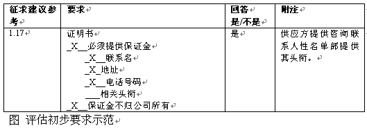 。。在評(píng)估的這一部分中通常不給予建議申請(qǐng)的"初步強(qiáng)制性要求"。但是,若不提供基本要求的信息,可能造成停止對(duì)某一特定建議評(píng)估。圖x中的示范工作表用來檢驗(yàn)供應(yīng)方對(duì)這些初步要求的回應(yīng)。