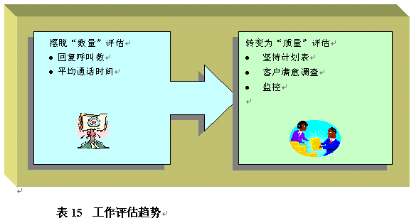 。。這些年呼叫中心工作評估經(jīng)歷了一些變化。最新趨勢是擺脫死板的"數(shù)量"評估,例如回復(fù)呼叫數(shù),通過客戶滿意度調(diào)查和監(jiān)控進(jìn)行數(shù)量評估以外的更全面的質(zhì)量評估。在表14中指出這種最新的工作評估趨勢的原因是,大量數(shù)量評估,例如回復(fù)呼叫數(shù),實(shí)際上已經(jīng)不能使員工在其基礎(chǔ)上進(jìn)行改善。例如,一個(gè)每小時(shí)接聽十個(gè)呼叫的員工并不比每小時(shí)僅接聽五個(gè)呼叫的員工效率更高。呼叫中心管理者評估員工工作更好的辦法是在這種數(shù)量評估中加入額外的質(zhì)量評估。