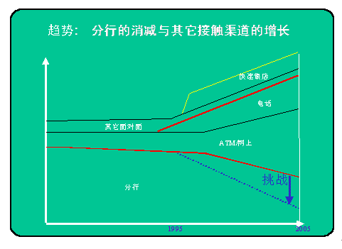 。。下圖為國(guó)外專家對(duì)銀行不同客戶服務(wù)渠道發(fā)展比例的說(shuō)明?梢钥吹剑瑺I(yíng)業(yè)廳的比例在逐年下降,而國(guó)外不少銀行甚至將進(jìn)一步壓縮營(yíng)業(yè)廳比例作為一項(xiàng)渠道的任務(wù)。電話銀行也就是通過(guò)IVR實(shí)現(xiàn)的自助服務(wù),自然是呼叫中心的一部分,但人工服務(wù),包括對(duì)上網(wǎng)及其它互動(dòng)方式的客戶提供的座席代表服務(wù),當(dāng)然更是現(xiàn)代呼叫中心業(yè)務(wù)的一部分,圖上雙紅線內(nèi)所表示的正是不斷發(fā)展的呼叫中心的所占比例。