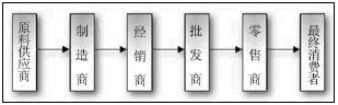 在社會(huì)化大生產(chǎn)的前提下,任何商品被制造和被消費(fèi)的過(guò)程,實(shí)際上是在多個(gè)環(huán)節(jié)、多個(gè)商家進(jìn)行“傳遞”的過(guò)程,這一過(guò)程構(gòu)成的“通道”就是“供應(yīng)鏈”。供應(yīng)鏈的研究就是從分銷(xiāo)模式開(kāi)始的。在分銷(xiāo)模式下,最常見(jiàn)的價(jià)值傳遞的通道如下圖所示: