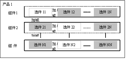 產(chǎn)品是由多個(gè)組件組成的,而組件則由多個(gè)選件組成。組件可以是有形的(如電腦硬盤)也可以是無形的(如保修期),產(chǎn)品,組件與選件的關(guān)系可以由圖6、2、2來說明。