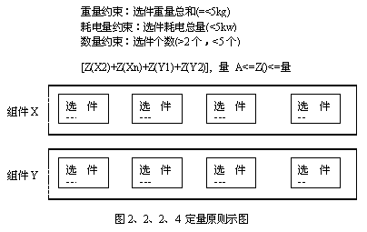 定量原則應(yīng)用于產(chǎn)品配置,是對所選擇選件的各種量的規(guī)定。比如,組件內(nèi)選件數(shù)量的最少或最高原則,或選件重量總和的最大最小原則等,是定義在組件層面的約束,如圖2、2、2、4所示。