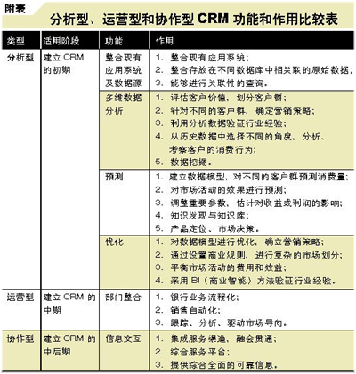 在上述目標(biāo)下,有什么類型的產(chǎn)品可供選擇呢?對銀行來說,有分析型、運(yùn)營型和協(xié)作型3類CRM,而這3類CRM也有著很大差別,對于有不同需求的銀行需要有不同的選擇。下面詳細(xì)分析這3類CRM。