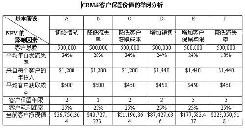 顯然,流失率是影響NPV的最重要因素,良好的客戶關(guān)系或客戶保留將創(chuàng)造更大的利潤(rùn)。從短期和長(zhǎng)期來說,"以客戶保留為中心"是回報(bào)最豐厚的CRM活動(dòng)。