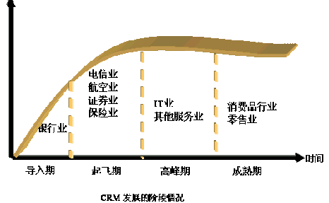 從圖中我們可以大致看出CRM的發(fā)展情況。保險(xiǎn),電信行業(yè)對這比較重視,而且得到了一定的應(yīng)用。但是在其他行業(yè)中的發(fā)展仍然比較緩慢。面對中國的龐大市場,從CRM的發(fā)展中不難看出:會隨著經(jīng)濟(jì)的發(fā)展得到長足的發(fā)展。隨著經(jīng)歷早期客戶是蒙昧期,后來是觀察期,現(xiàn)在是選擇期,CRM市場可能出現(xiàn)爆炸性的增長。CRM本身是很好的,發(fā)展到一定階段,引導(dǎo)期已經(jīng)過了,又會發(fā)展起來。
