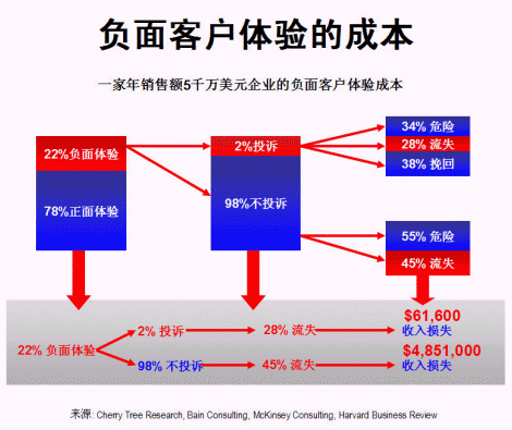 一家年銷售額五千萬美元的企業(yè),假設(shè)正面客戶體驗(yàn)為78%,負(fù)面體驗(yàn)為22%,在所有負(fù)面體驗(yàn)中,只有2%的客戶投訴,其余98%大多數(shù)均不投訴,保持沉默(這與現(xiàn)實(shí)情況頗為吻合)。在2%投訴客戶中,有34%經(jīng)過處理仍然未能令客戶完全滿意,尚有流失的危險(xiǎn);28%的客戶在處理后依然流失,余下38%的客戶則感到滿意,繼續(xù)留下。對大部分(98%)沒有投訴的客戶,因公司對他們的不滿意并不知情,所以沒有采取行動,55%的客戶有隨時(shí)流失的危險(xiǎn),其余45%已經(jīng)流失。